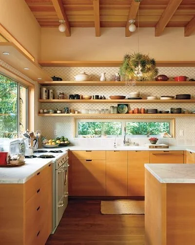 Open shelves with minimum casing can give a wide look to the kitchen. You will have enough space for storage and at the same time, this will add to the decor of the kitchen.