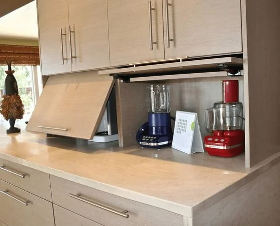 Keeping the countertop off the bulky appliances can create more free space eliminating the cluttered look. A section in the cabinets can act as your kitchen appliance garage to store those bulky appliances when not in use.