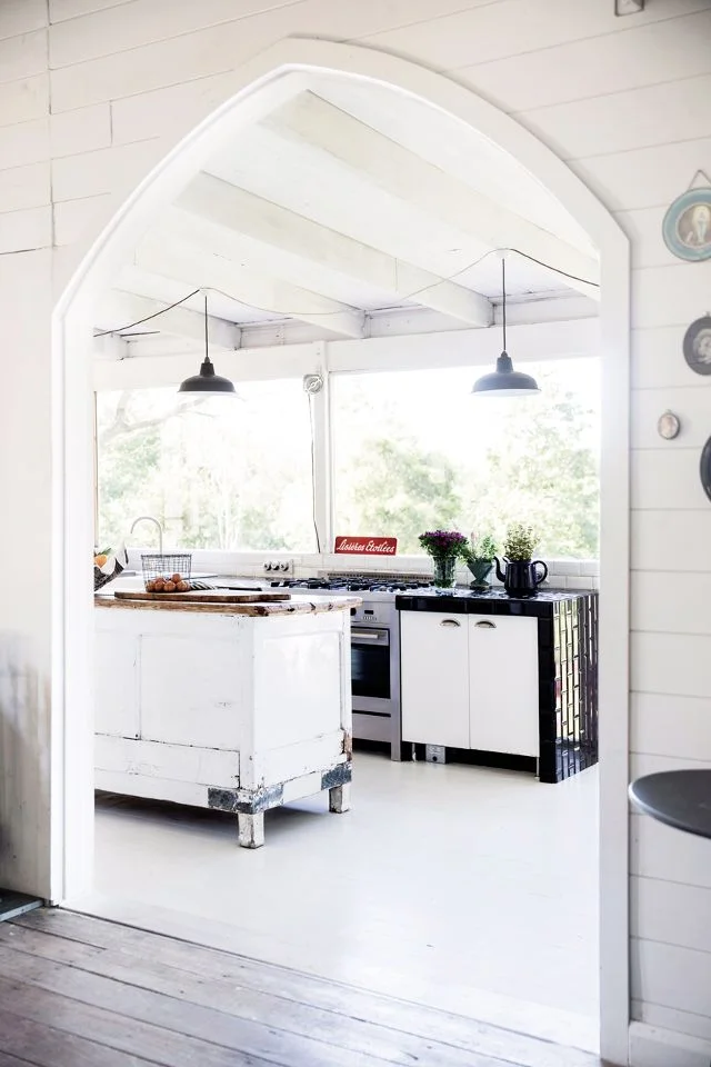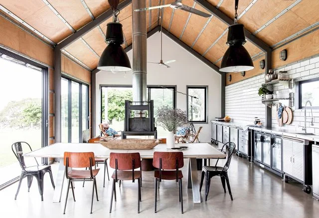 Large windows,exposed brickwork, cement flooring and lots of metal all constitute together to form a perfect modern kitchen.