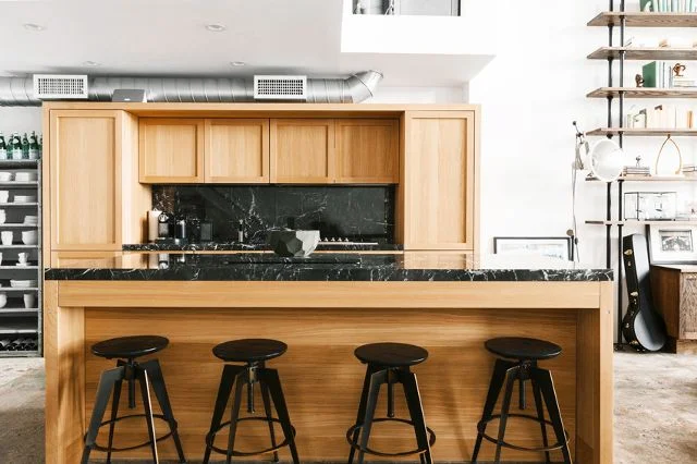 Cement floors,metals and exposed piping,the black marble counter drops and the back splash dress things up.The stools perfectly combine with the counter providing a perfect combination of modern and industrial style.