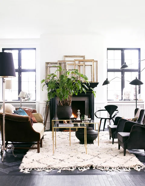 Everything stays within the restrained space. Then it works well, like chairs, pillows, picture frames and lamps. And the white rug cozies up a dark floor.
