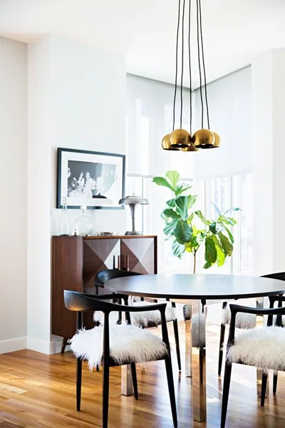 With the minimalist black table and chairs, add some textures of wood and plants to get a modern feel. White cushions will play the role of the highlighter.