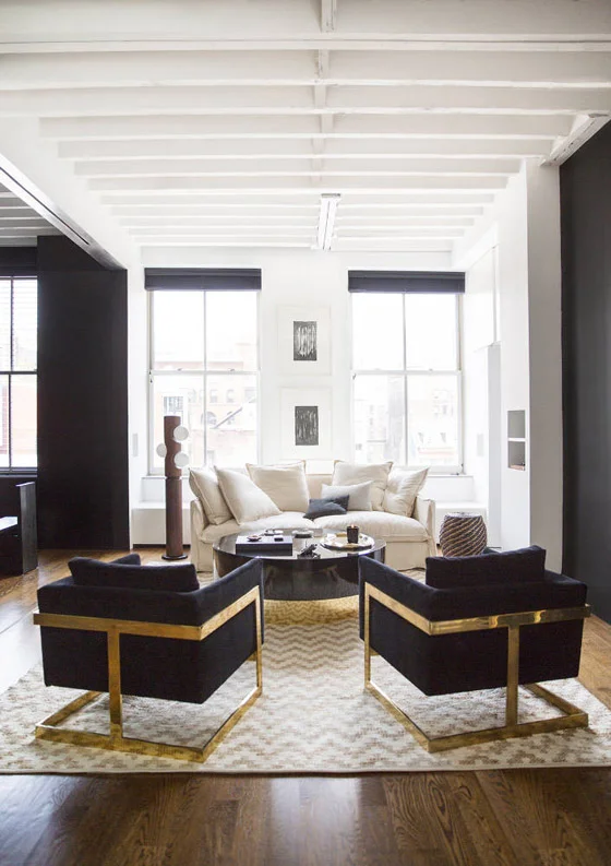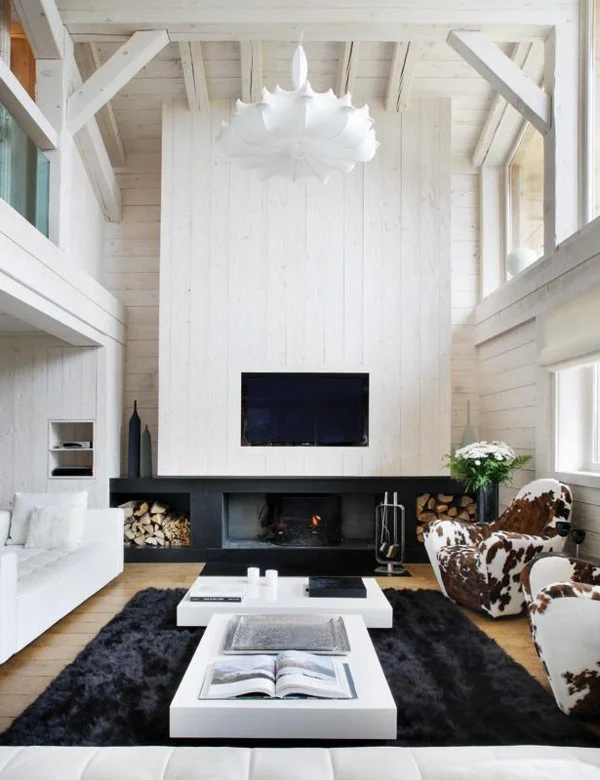 To give the space a large, open feel try adding black carpets on the floor with white coffee tables. And minimal furniture completes the picture.