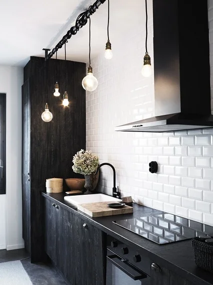 It makes it a lot easier to pull off black kitchen cabinets and appliances if the walls tiles are white. The right lighting will do the rest.