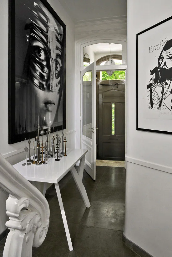 Large pieces of statement art in black and white can bring drama to a basic hallway or foyer.