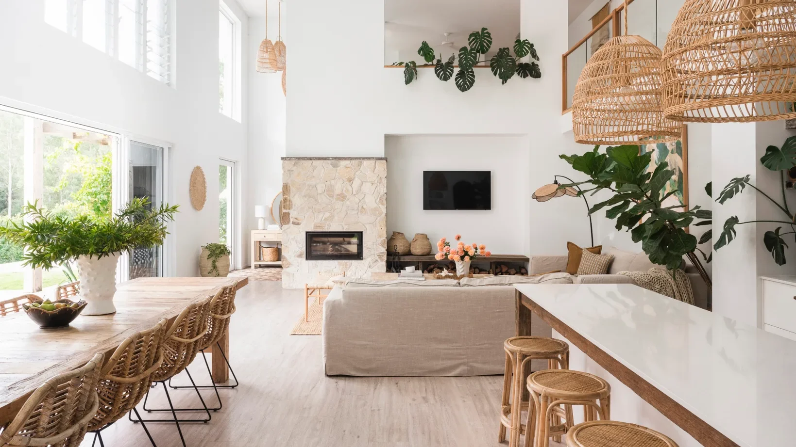 Use furniture with clean lines and light wood finishes. Keep your palette soft with whites, grays, and pastels. Add a few tropical plants like palms or monsteras to keep the air fresh and humid during dry months.